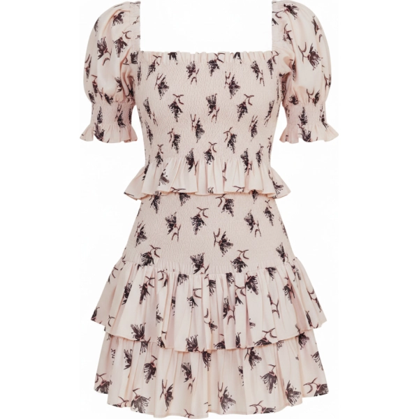 Conjunto de inspiración romántica, con top engomado y delicadas mangas abullonadas que aportan volumen y encanto, combinado con una falda de cintura engomada y doble volado en el ruedo que acompaña con movimiento cada paso.