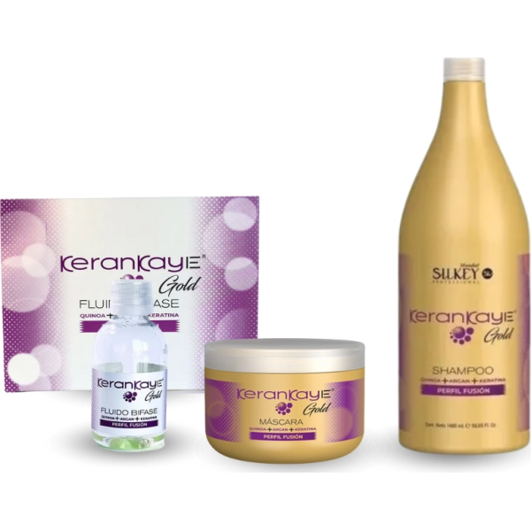 KERANKAYE GOLD – PERFIL FUSIÓNrnrnPara cabellos dañados, con coloración, muy decolorados o expuestos a tratamientos químicos como alisados, te recomendamos el uso de KERANKAYE GOLD Perfil Fusión.rnrnSu fórmula combina Aceite de Argán, Aceite de Quinoa y Keratina, logrando reconstruir internamente la fibra capilar y devolverle solidez, resistencia y vitalidad.rnEl resultado es un cabello visiblemente más saludable, fuerte y brillante.